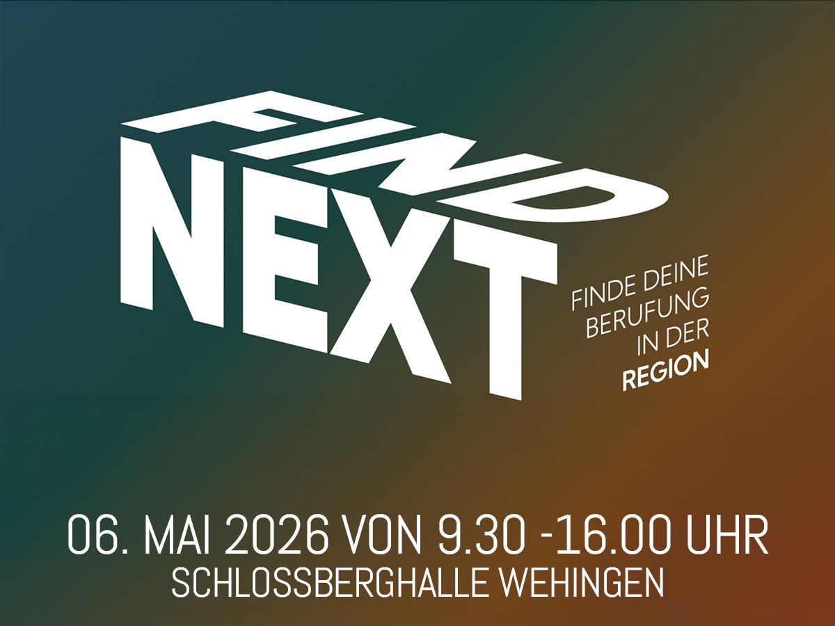 Am 06.05.2026 sind wir von 9:30 bis 16:00 Uhr auf der FindNext Ausbildungsmesse in der Schlossberghalle in Wehingen am Start. Komm vorbei und lern uns persönlich kennen!